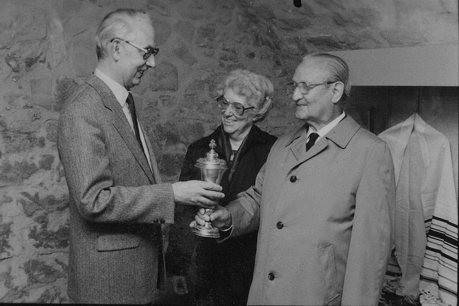 Erich Guggenheim (1906-1987) übergibt zusammen mit seiner Frau Margot der Stadt Worms einen Silberpokal der Mutter Ida Sander (1879), 1984 Foto: Stadtarchiv Worms, Fotoabteilung F 5779/2 (P6283422)