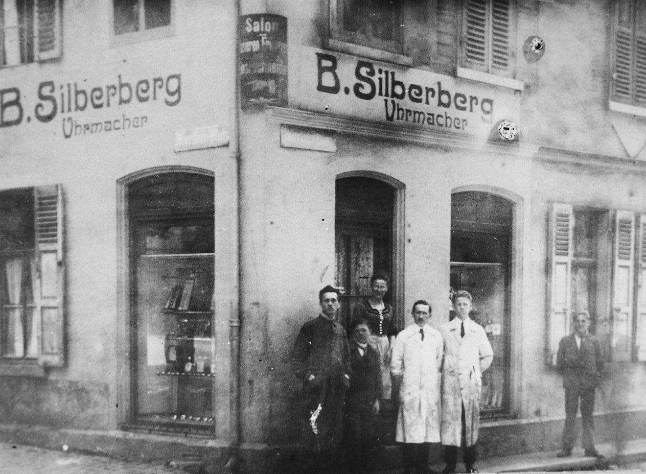 Uhrmachergeschäft Silberberg, Mitarbeiter vor dem Geschäftshaus, Martinsplatz, ca. 1920/30 Foto: Stadtarchiv Worms, Fotoabteilung F 6386/53 (P6143316)
